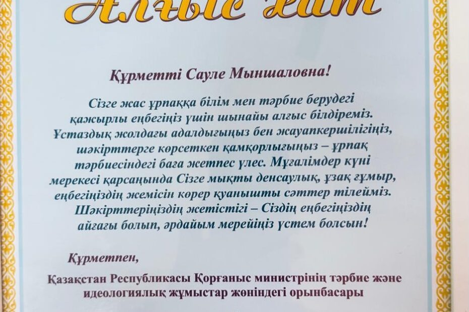 Құттықтау! Бүгін мектебіміздің директоры Азимханова Сәуле Мыңшалқызына ҚР Қорғаныс министрінің…Қазан 10, 2025