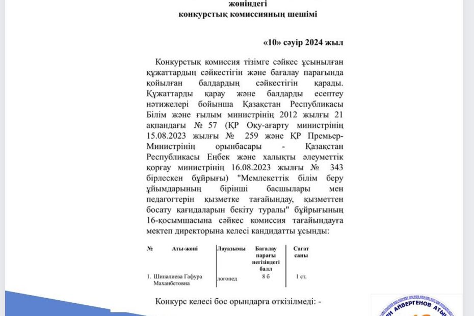 Астана қаласы әкімдігінің «Т.Айбергенов атындағы №16 мектеп» шаруашылық жүргізу құқығындағы…Сәуір 11, 2024
