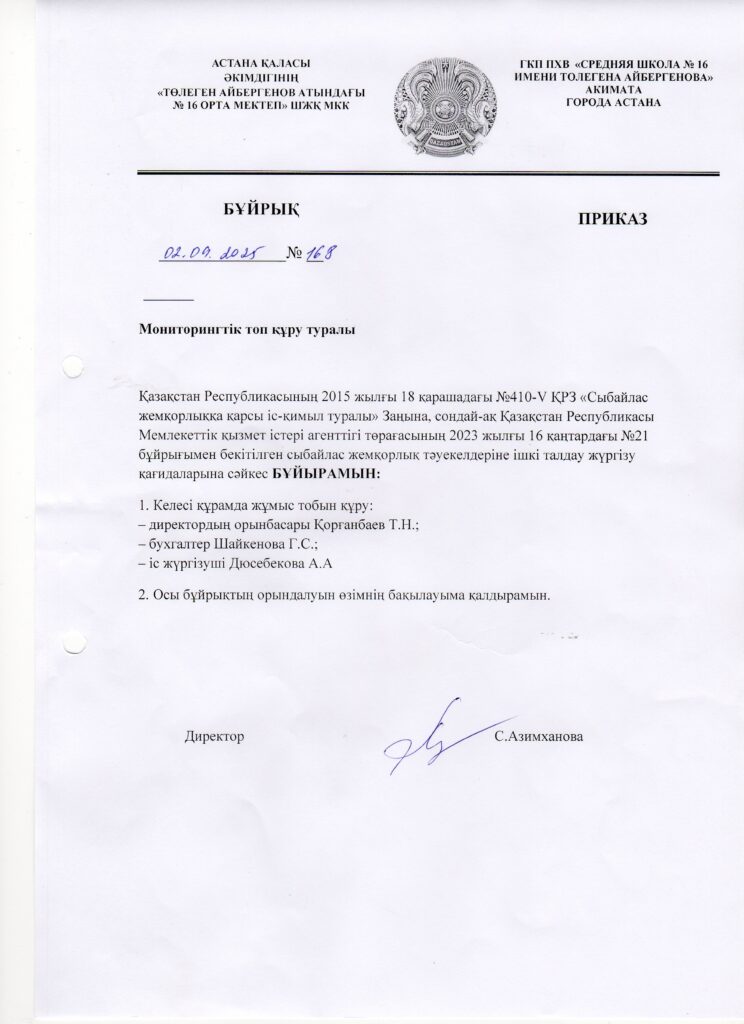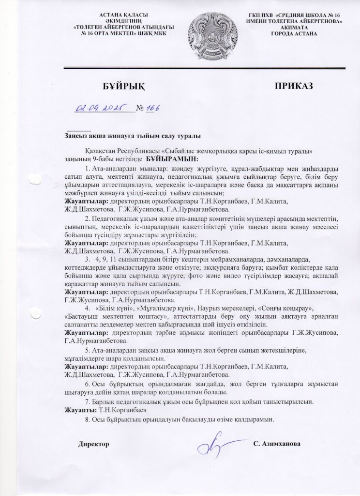 Астана қаласы әкімдігінің "Төлеген Айбергенов атындағы №16 жалпы орта білім беретін мектеп" шаруашылық жүргізу құқығындағы мемлекеттік коммуналдық кәсіпорны